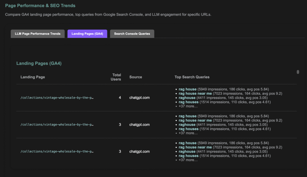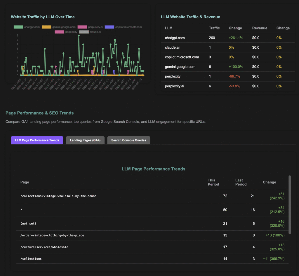 Our hybrid insights bridge LLM mentions with GA4 and GSC data to show what’s driving traffic – and what could.