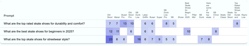 LLMs, unlike search engines, are not indexing brand pages. They are synthesizing human knowledge — often favoring iconic products, high-review items, or culturally resonant shoes.